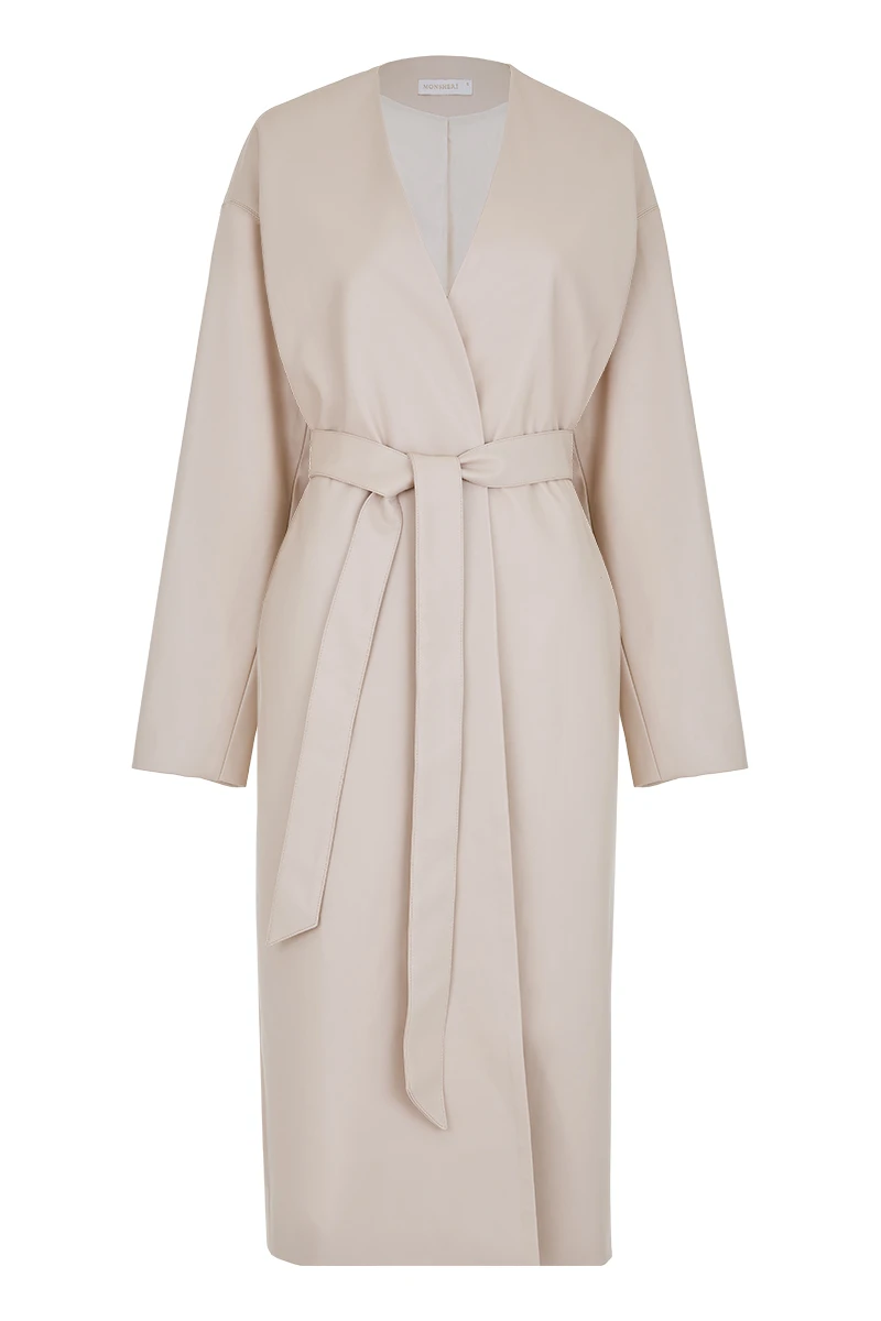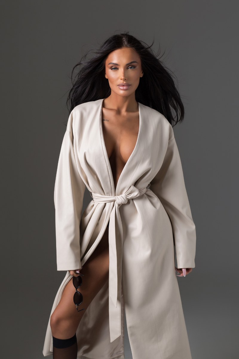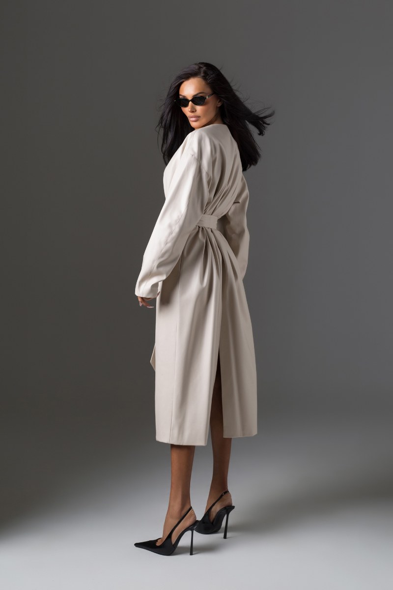 Бежевый тренч Monte из экокожи сочетает в себе классический стиль и современные материалы. Легкая фактура и элегантный крой делают его идеальным вариантом для прохладных дней, подчеркивая утонченность и уверенность в себе.